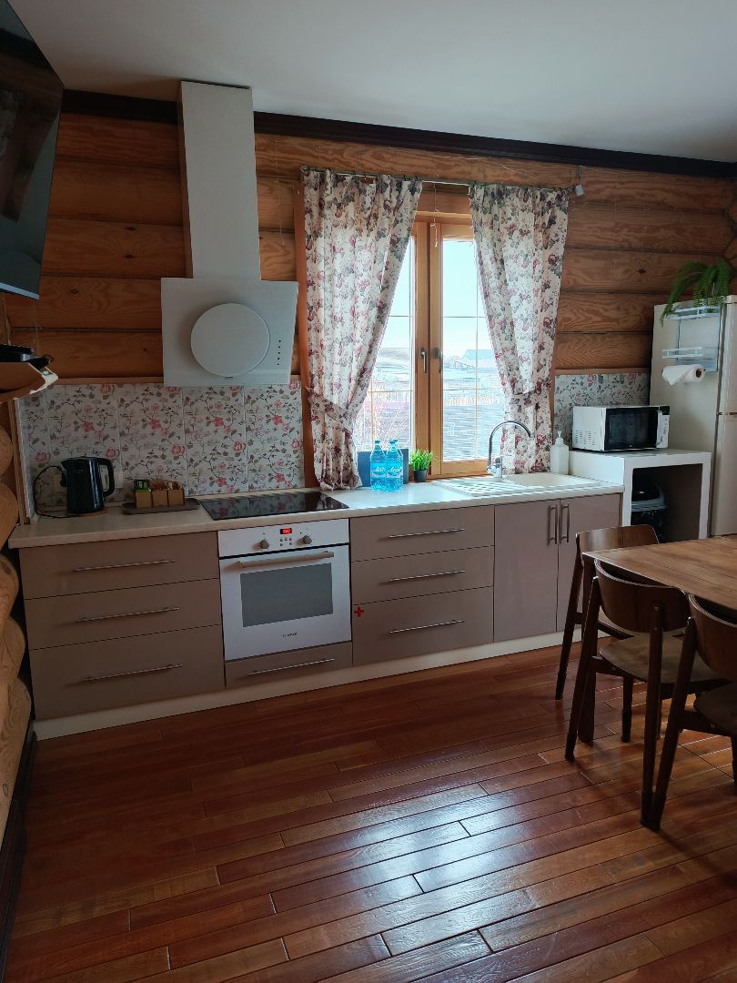 Кухня-гостиная полностью укомплектована техникой и посудой. Холодильник, варочная панель, духовой шкаф, микроволновка, чайник, кухонные принадлежности - всё есть для комфортного приготовления и приёма пищи.