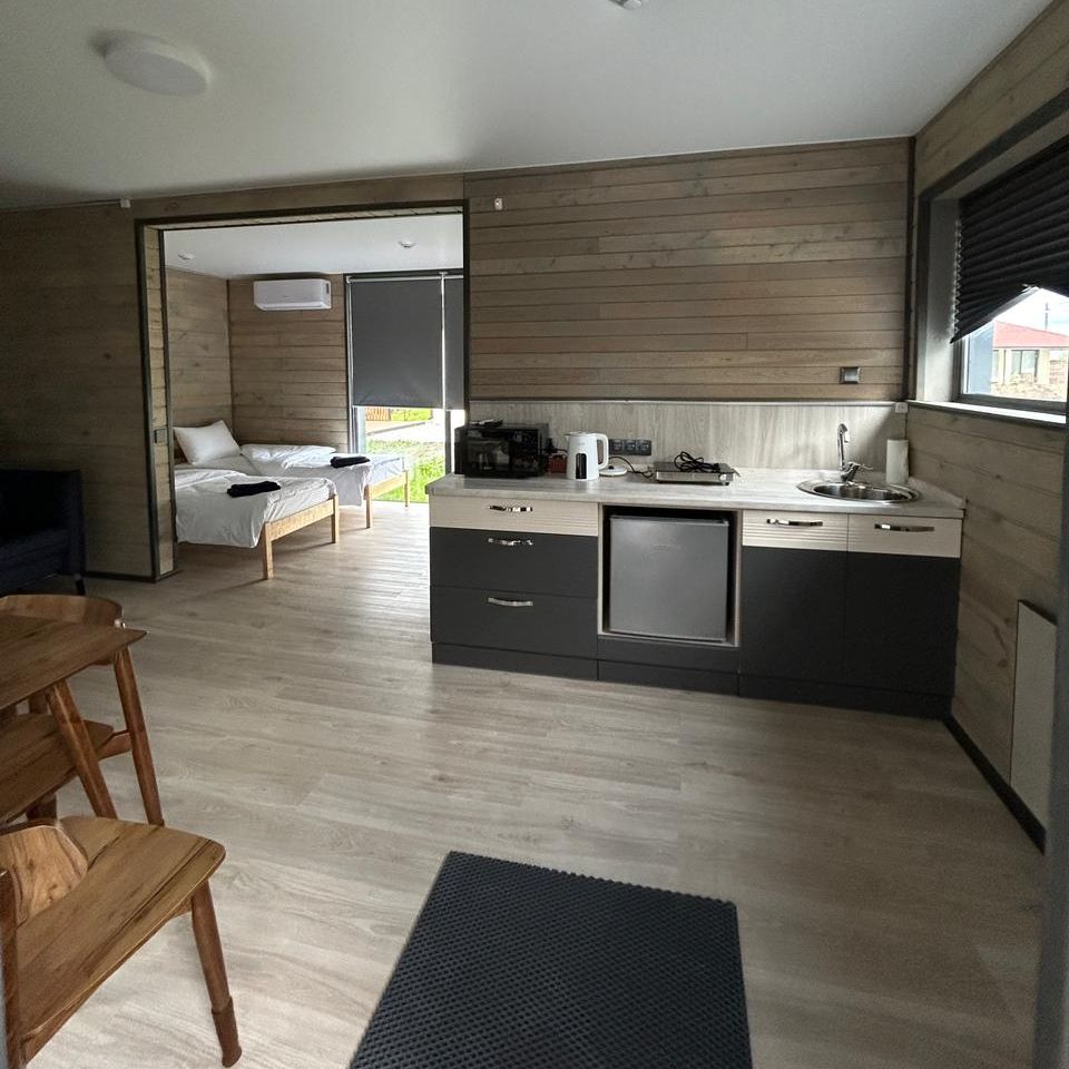 Вместимость 4 человека. Диван (двуспальный), две односпальные кровати. Оборудованная техникой и посудой кухонная зона. Душ,туалет,фен,водонагреватель. Кондиционер. Электрические батареи.