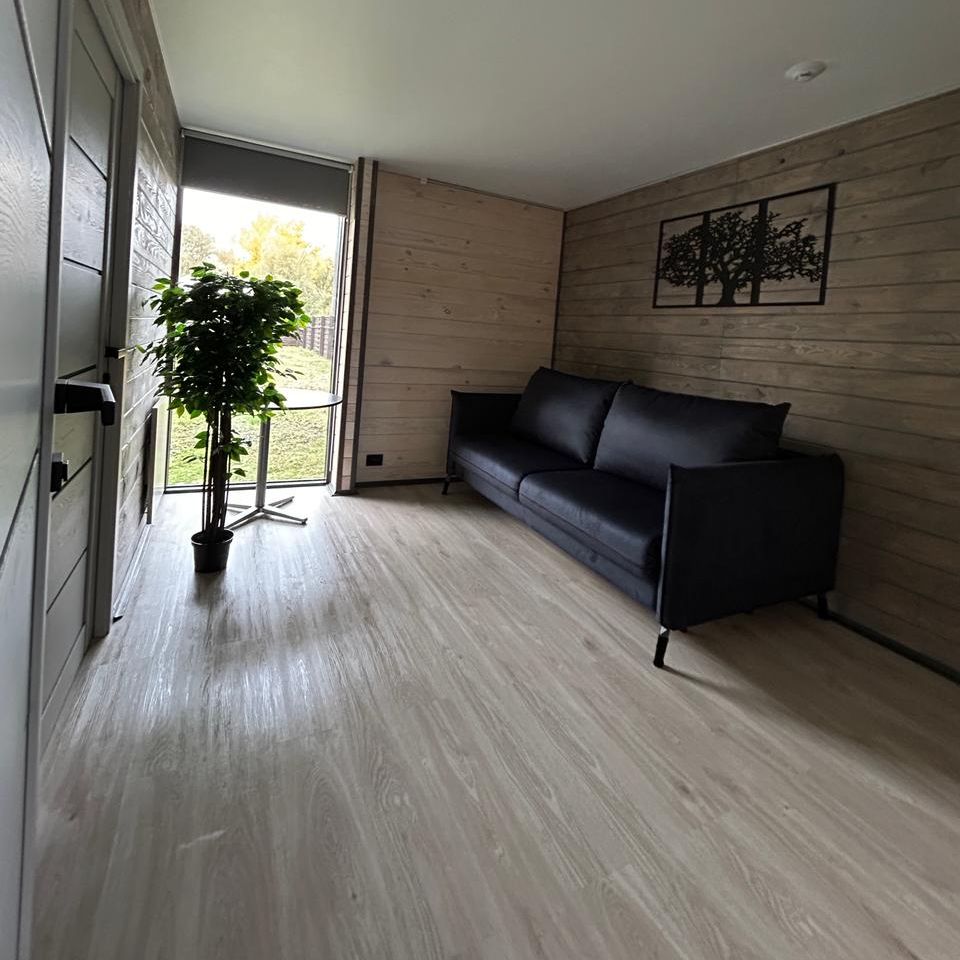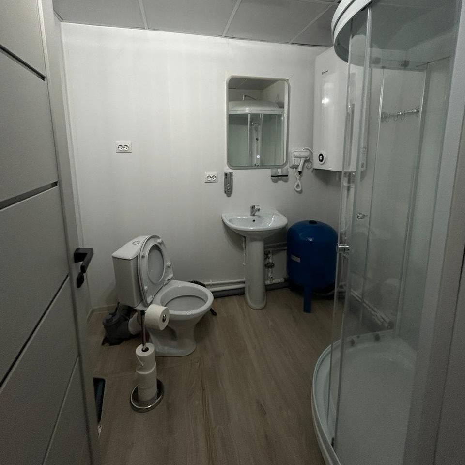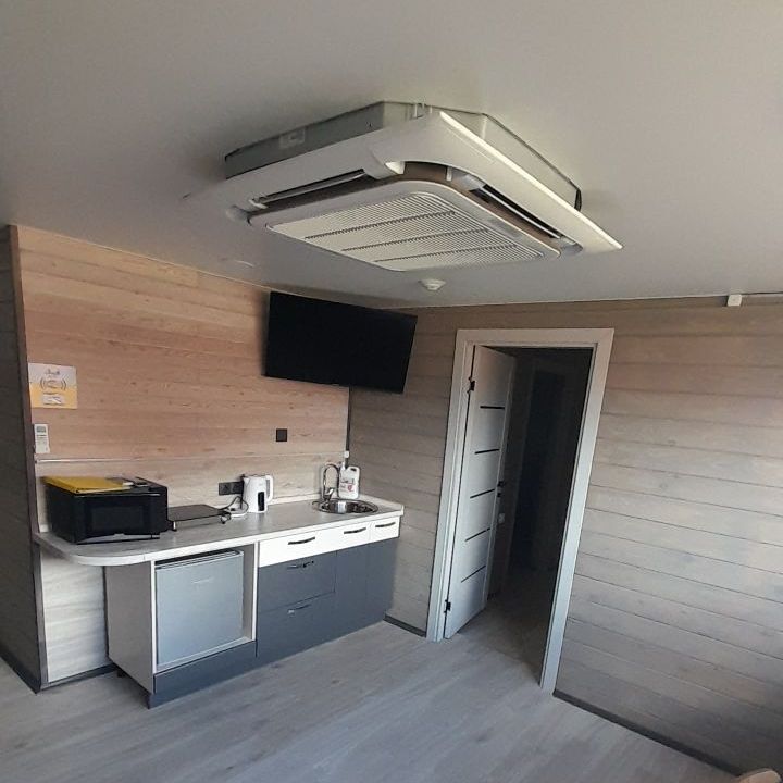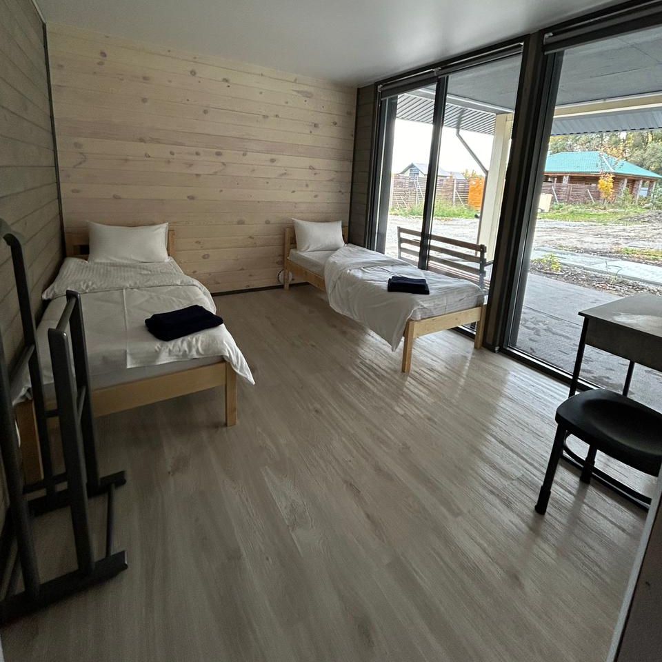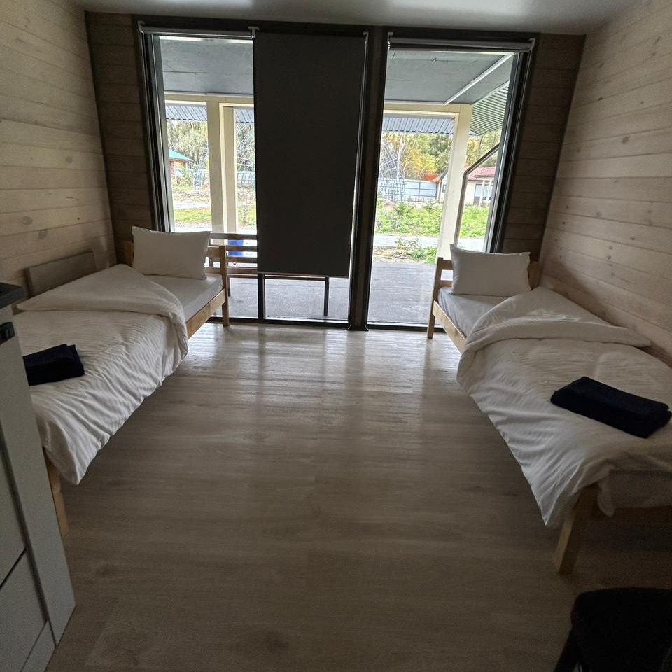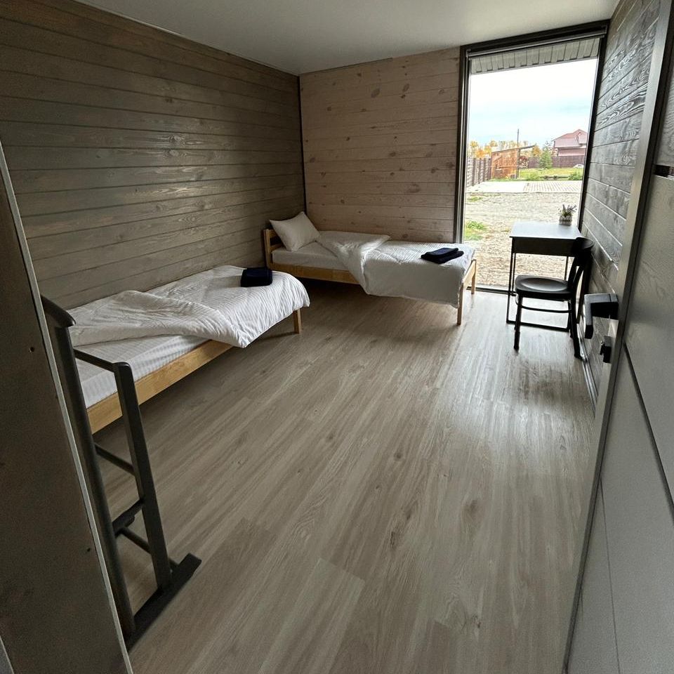 Вместимость 8 человек. 3 спальни, односпальные кровати, диван. Оснащенная всей техникой и посудой кухонная зона. Душ, туалет,фен. В летний зной спасает установленный кондиционер, а зимой согреют электрические батареи.
