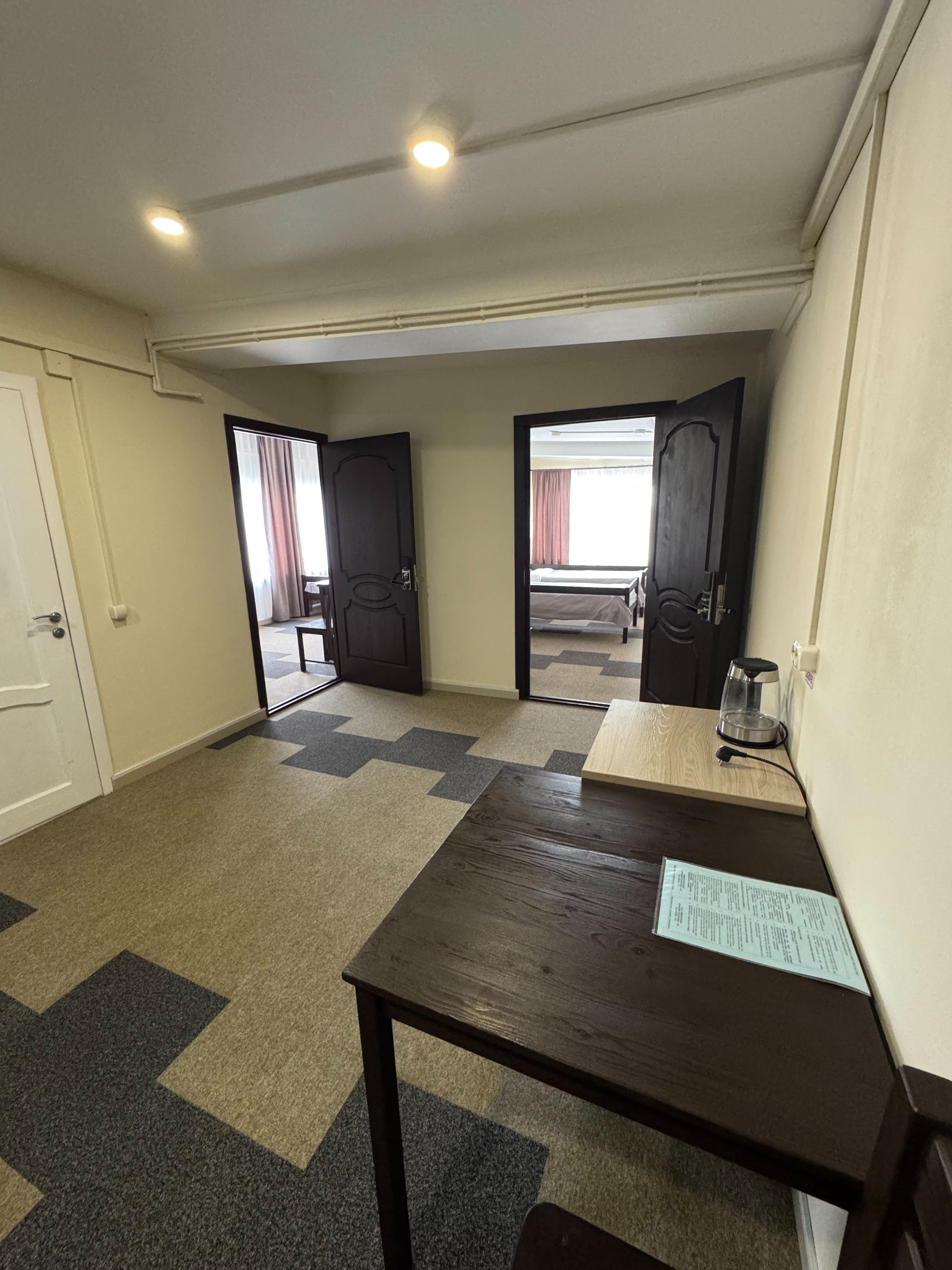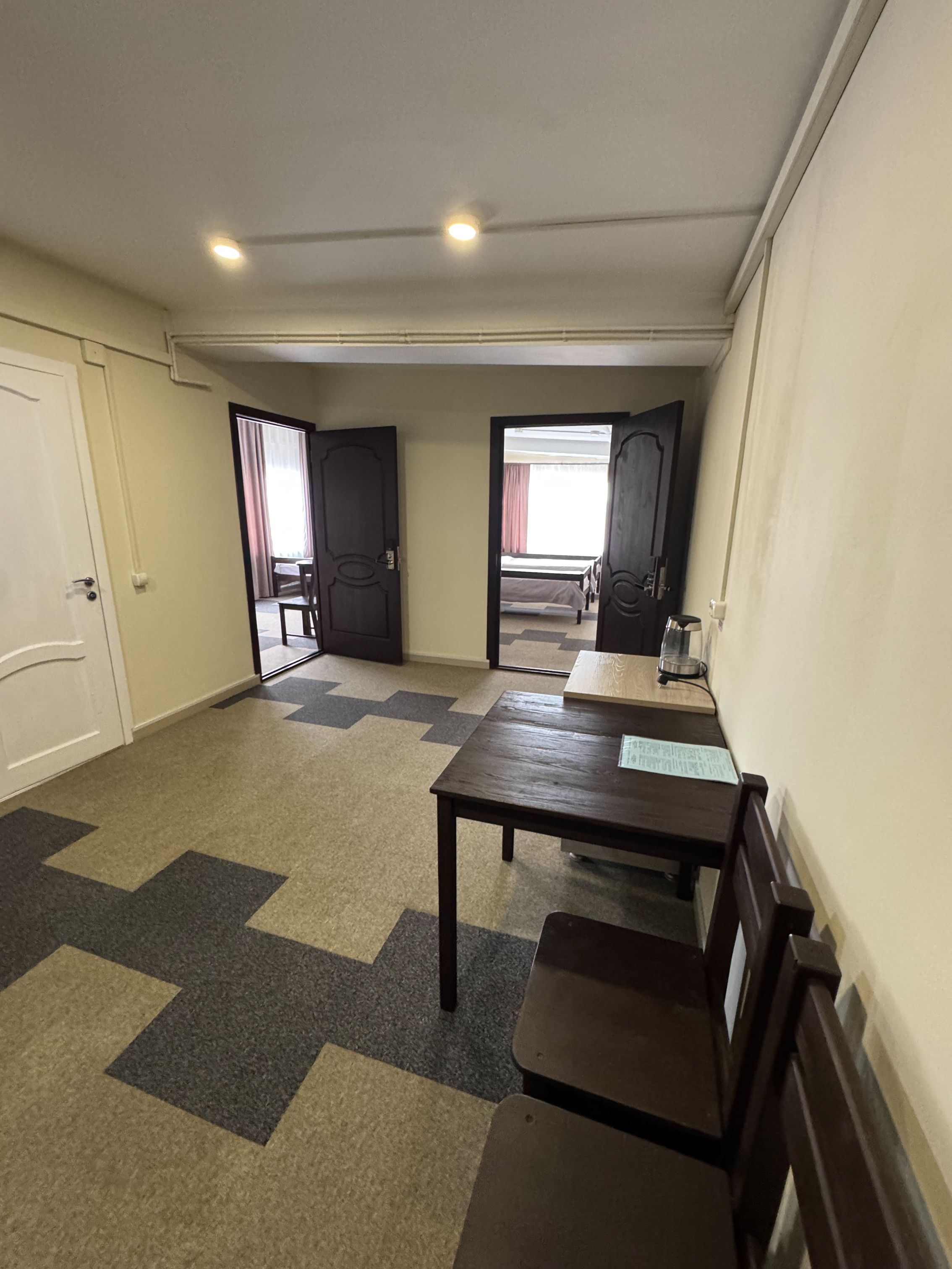 Трехкомнатные номера - это оптимальный вариант для размещения гостей с различными целями пребывания. Есть номера с совмещенным и раздельными санузлами, в которых есть все необходимое: душевая кабина, гигиенический душ, косметическое зеркало, туалетные принадлежности, фен, набор полотенец.