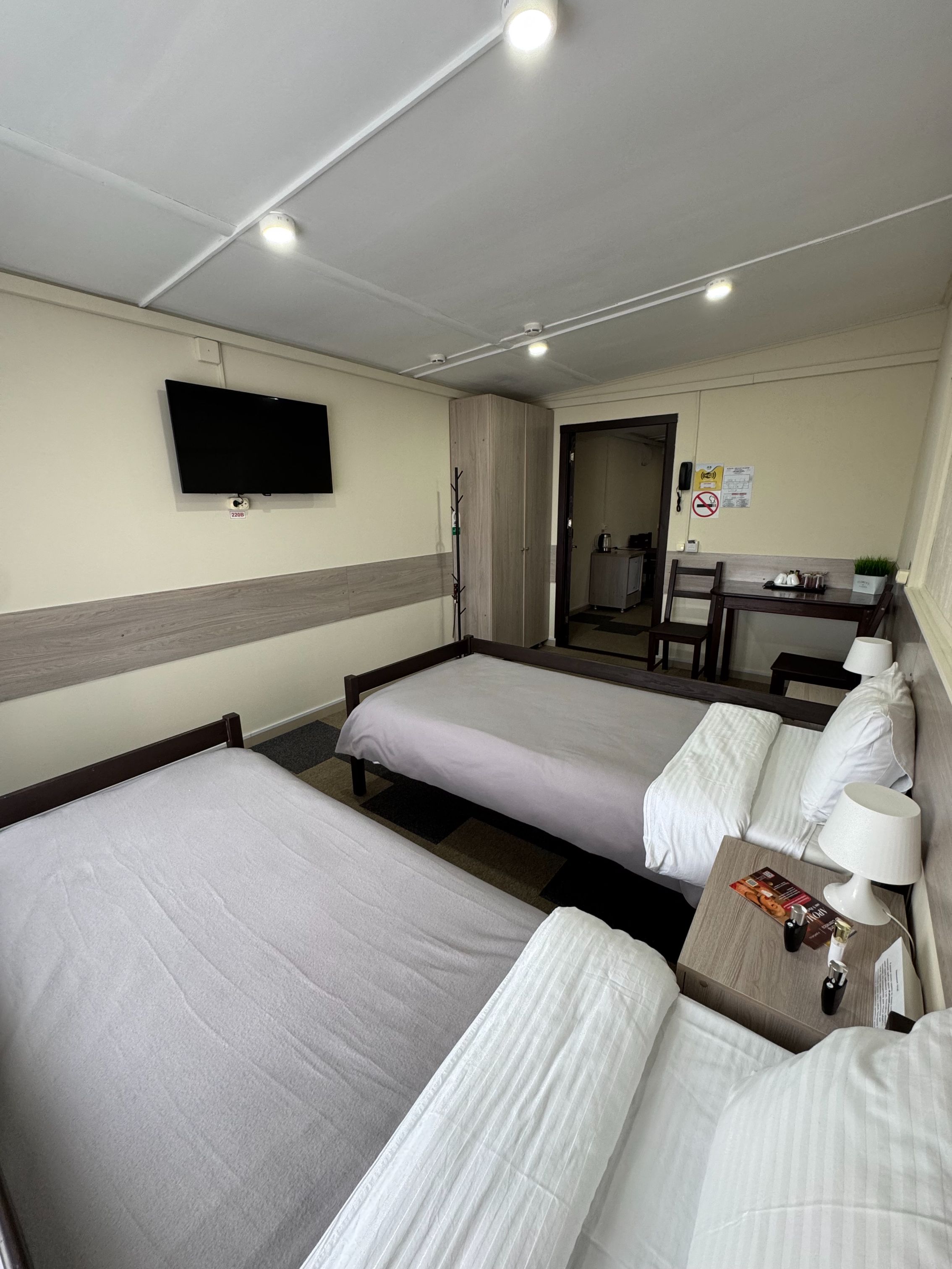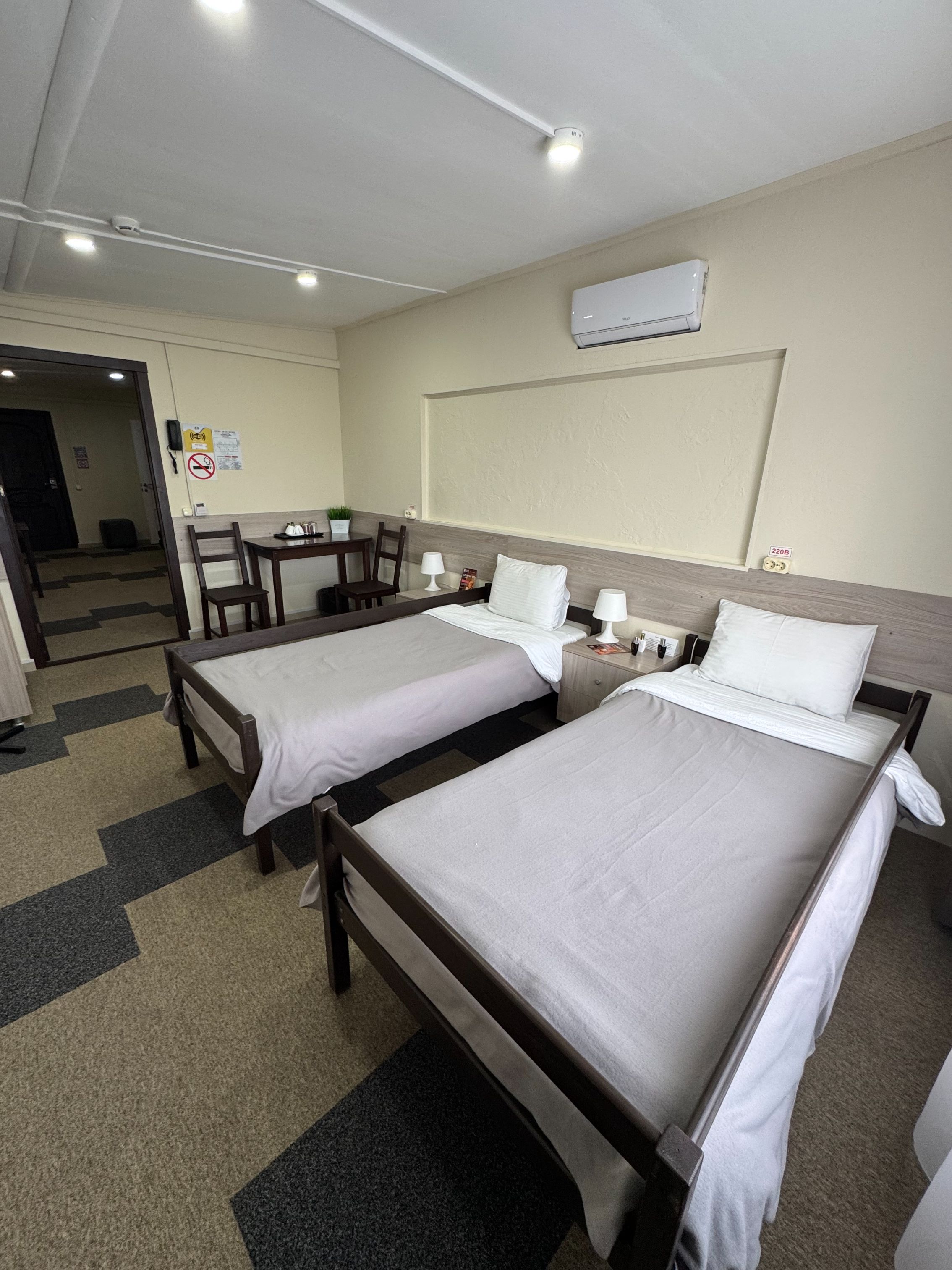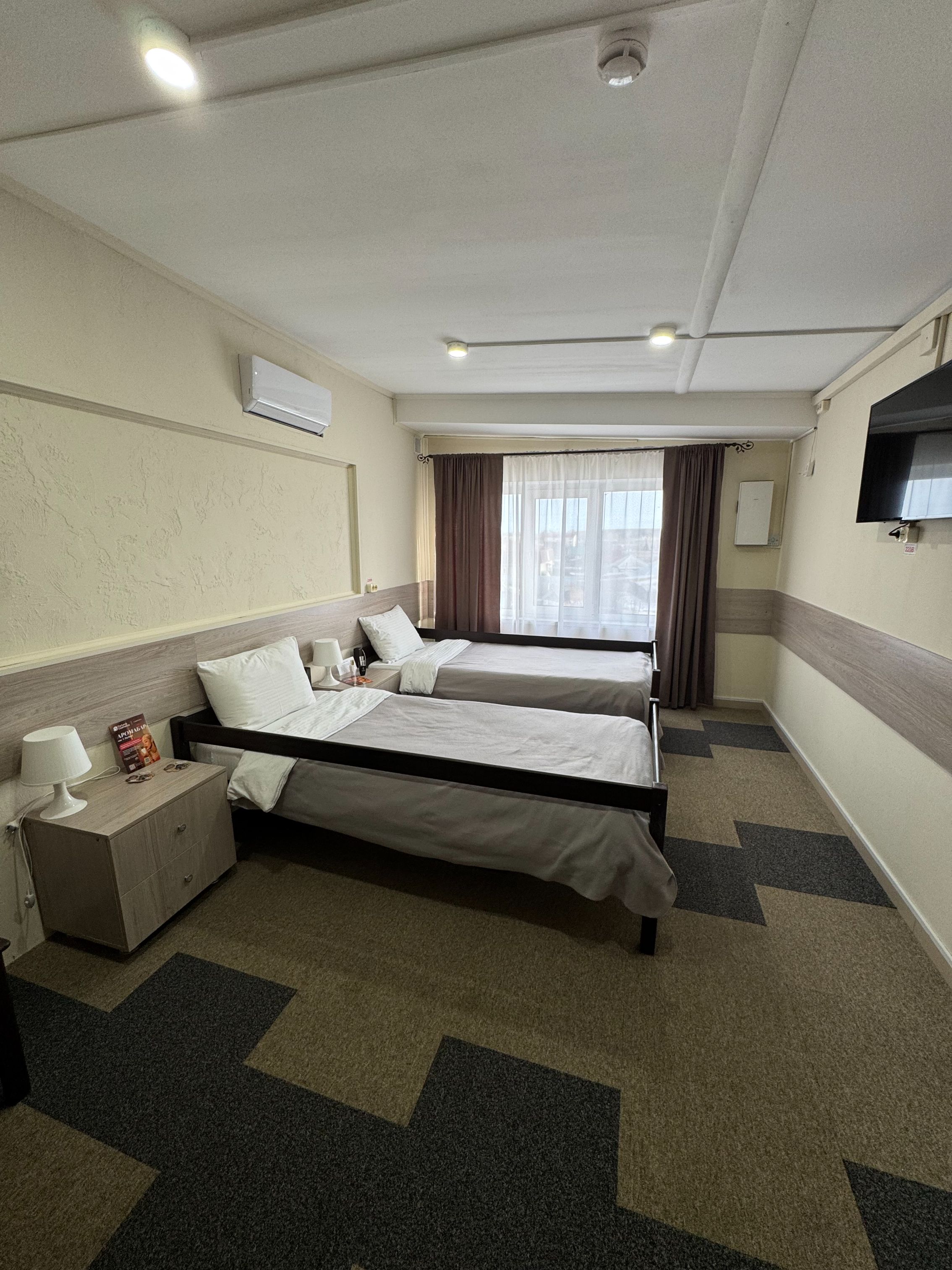 В каждой спальне расположены две односпальные кровати 90*200 см, шкаф для одежды, прикроватные тумбы, стол со стульями, гостиничная парфюмерия. Есть кондиционер и телевизор.