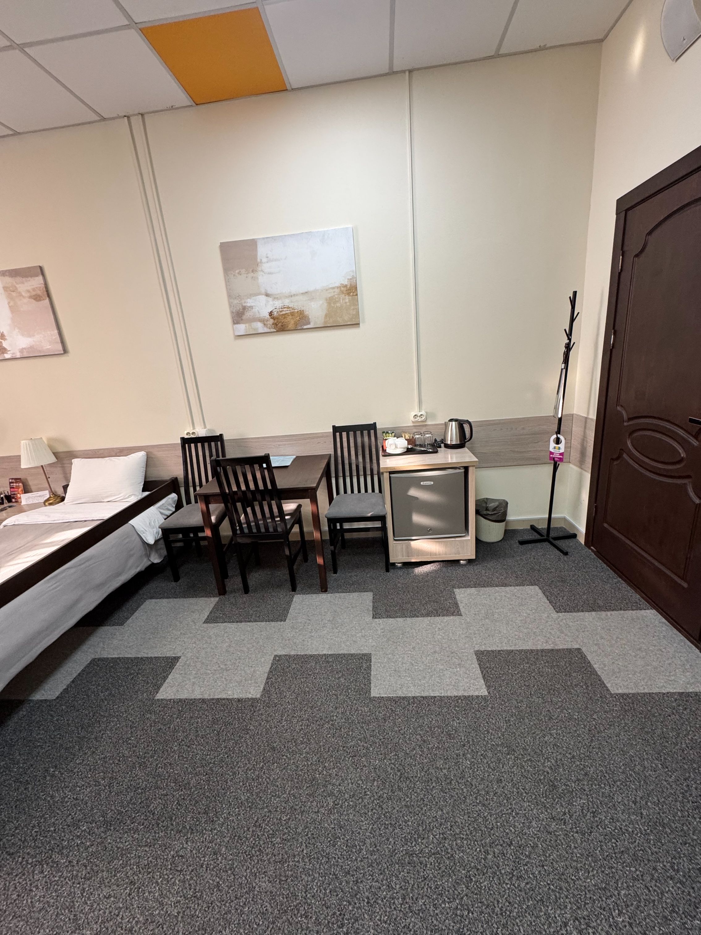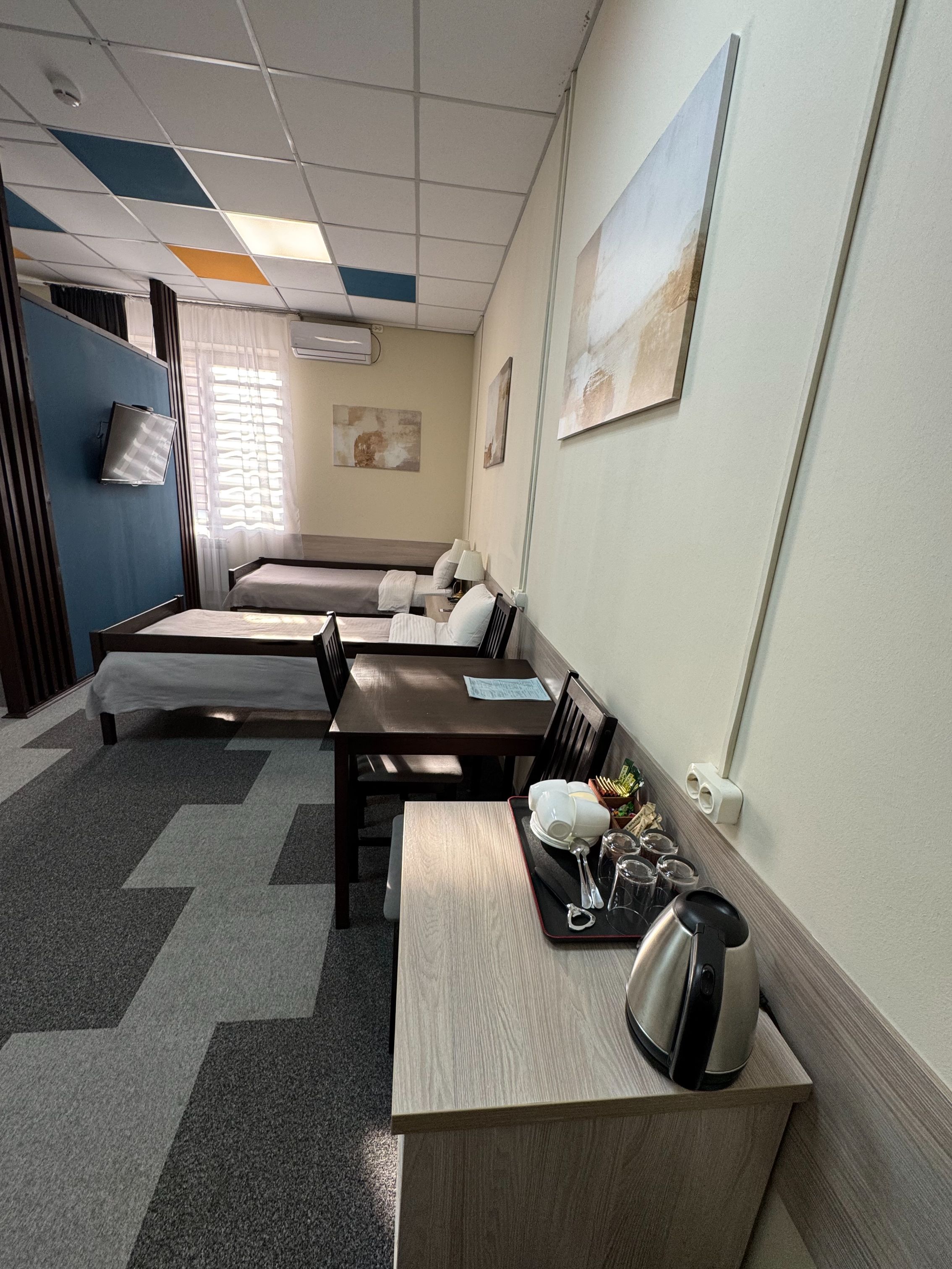 В номере: кондиционер, две основные односпальные кровати 90см*200см + две дополнительные односпальные кровати 90см*200см, два телевизора, шкаф с большим зеркалом, прикроватные тумбы, светильники, стол со стульями, мини-холодильник, чайник с чайным набором.